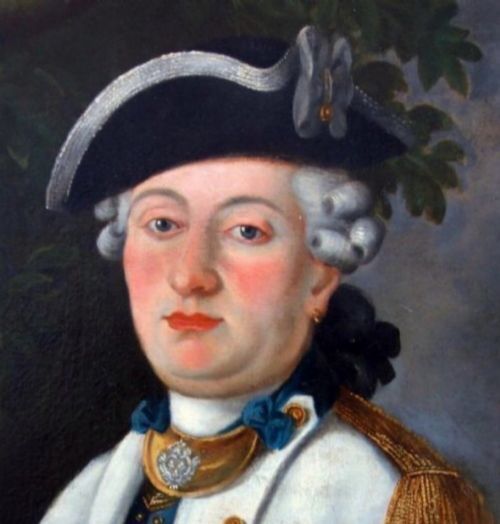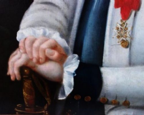 The officers hands are extremely well defined and his appearance is of nobility, his grey powdered hair held in perfect curls and with a gold ear ring pierced through the lobe of his ear.