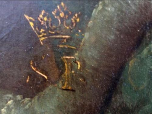 The portrait has been signed with initials S.R below a crown in the top left corner of the canvas.