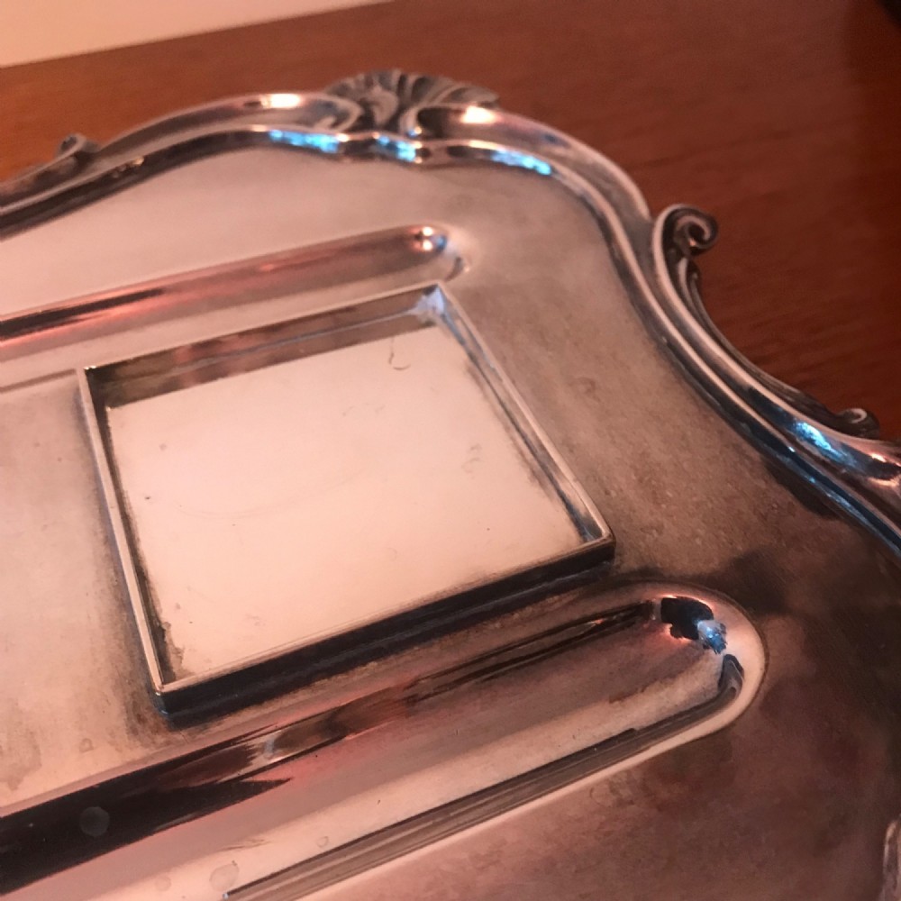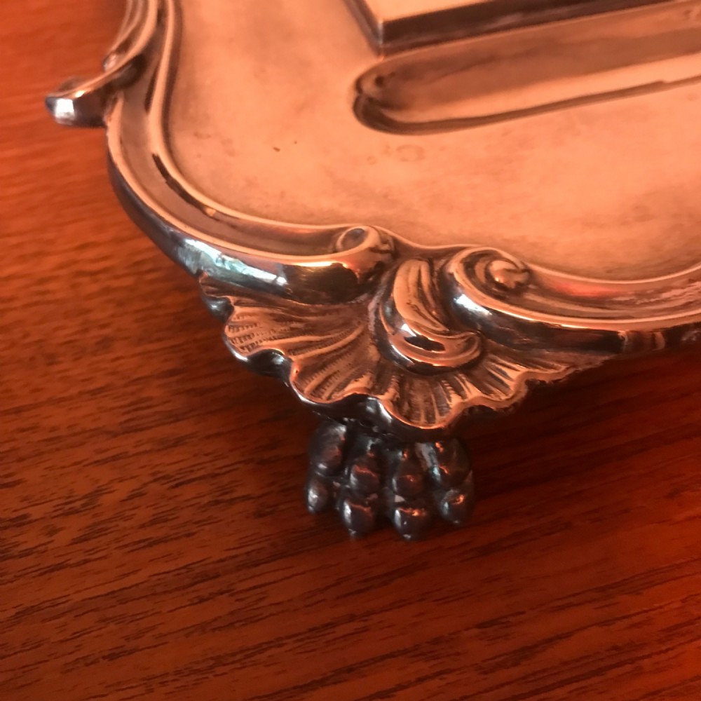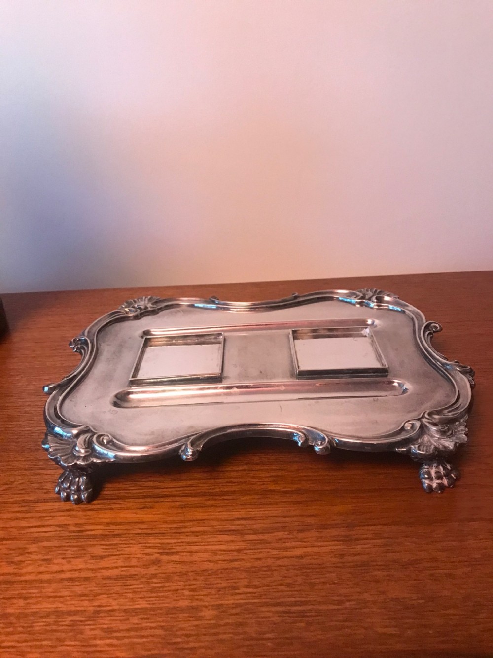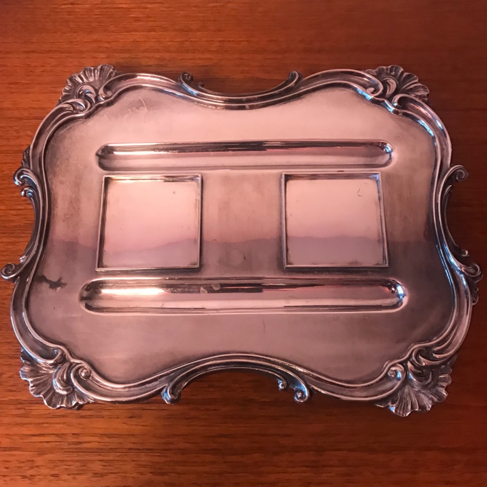 TOP QUALITY / VERY WELL MADE / EXPENSIVE Silver Plated Desk Ink & Pen Stand Size : 12.5 Ins (32cm) x 9.75 Ins (25cm) x Height 1.5 Ins (4cm) A real quality piece beautifully crafted and very heavy indeed, with escalopes shell design above the corner feet, typical of the 1910 dateline. Need two square glass ink wells which are not supplied. Maker Stamp underneath SW ? Originated Harrods London. DELIVERY : UK Only £20 P & P TELEPHONE ENQUIRIES 07765 856171 Payments are accepted by Bank Transfer & by Debit / Credit Cards Via the BUY NOW Payment Link Tab shown below each items description. PAY-PAL Account Holders are welcome. CHEQUES Drawn from UK banks. Internal Ref: RBC/OWN
