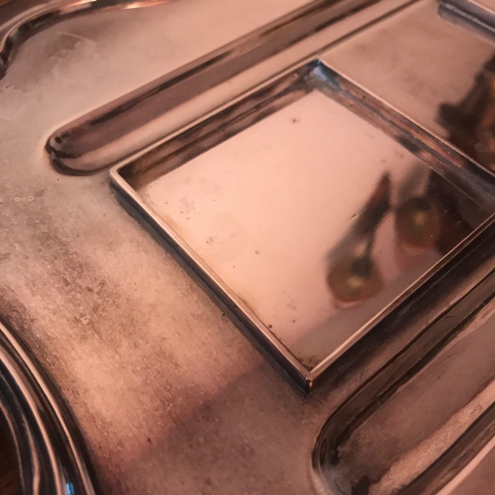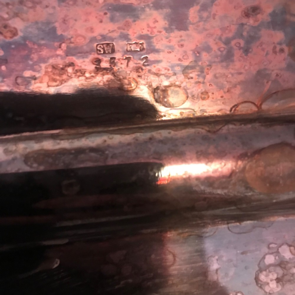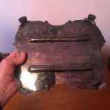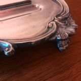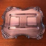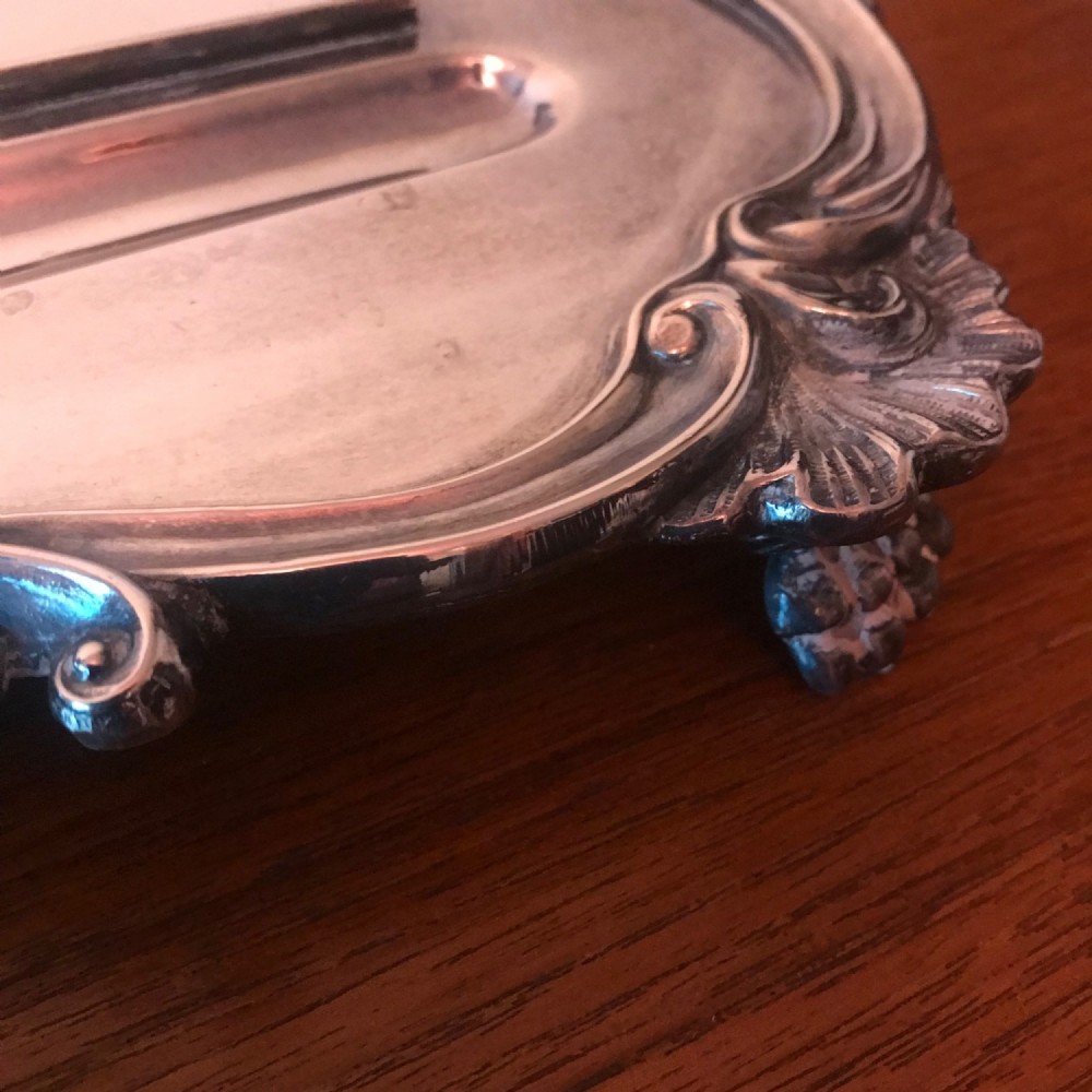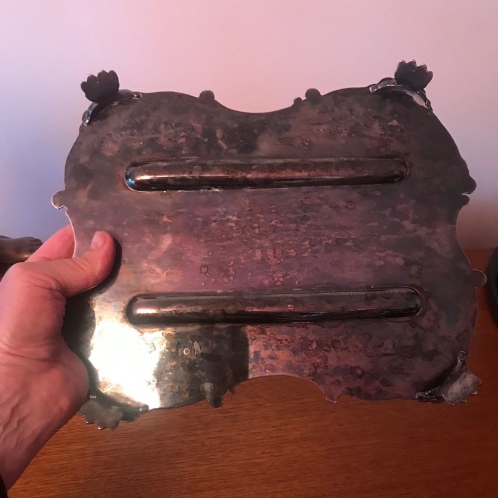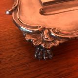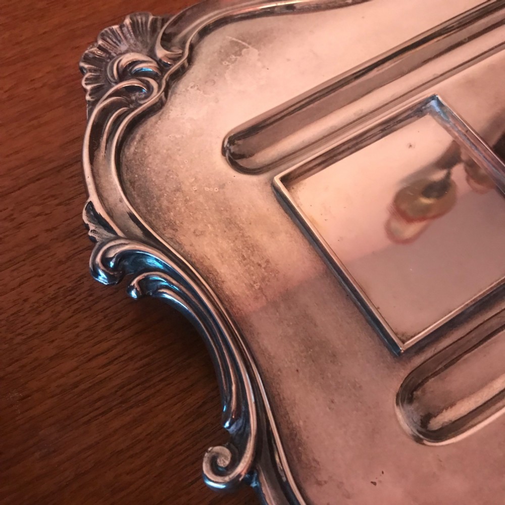 TOP QUALITY / VERY WELL MADE / EXPENSIVE Silver Plated Desk Ink & Pen Stand Size : 12.5 Ins (32cm) x 9.75 Ins (25cm) x Height 1.5 Ins (4cm) A real quality piece beautifully crafted and very heavy indeed, with escalopes shell design above the corner feet, typical of the 1910 dateline. Need two square glass ink wells which are not supplied. Maker Stamp underneath SW ? Originated Harrods London. DELIVERY : UK Only £20 P & P TELEPHONE ENQUIRIES 07765 856171 Payments are accepted by Bank Transfer & by Debit / Credit Cards Via the BUY NOW Payment Link Tab shown below each items description. PAY-PAL Account Holders are welcome. CHEQUES Drawn from UK banks. Internal Ref: RBC/OWN
