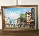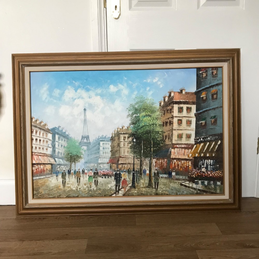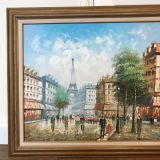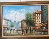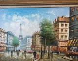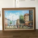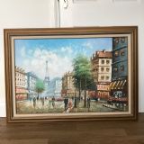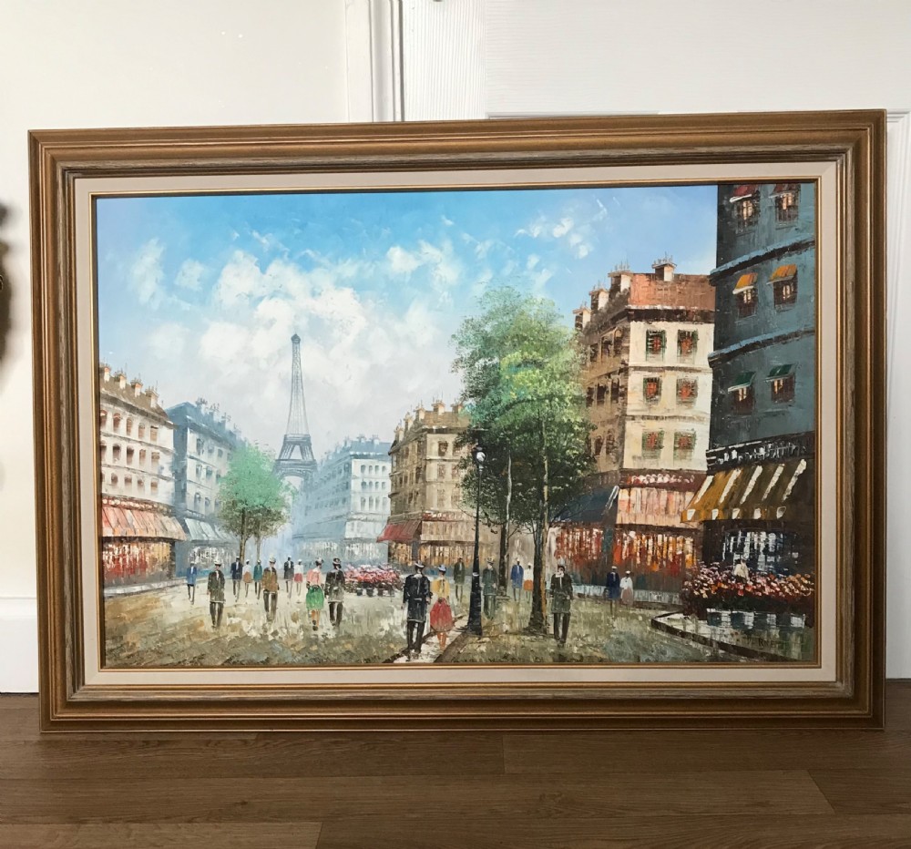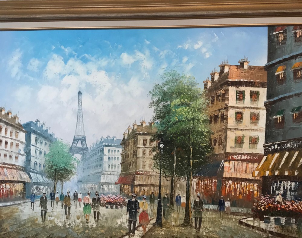 A beautiful large scale original oil on canvas painting of a Parisian street scene with the Eiffel Tower prominent in the background.