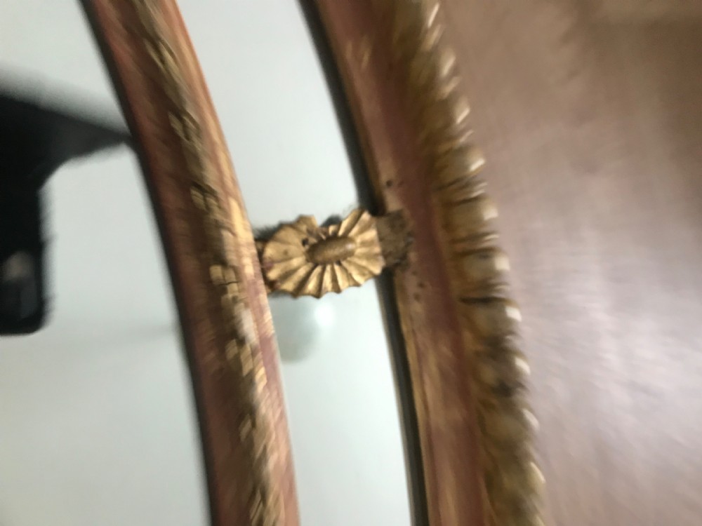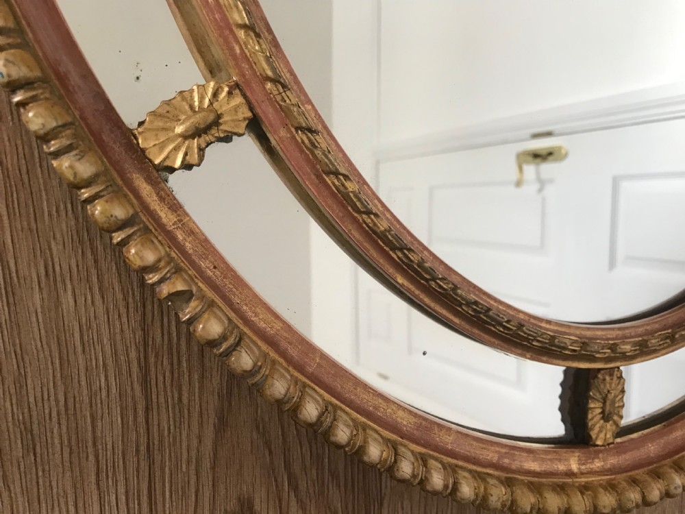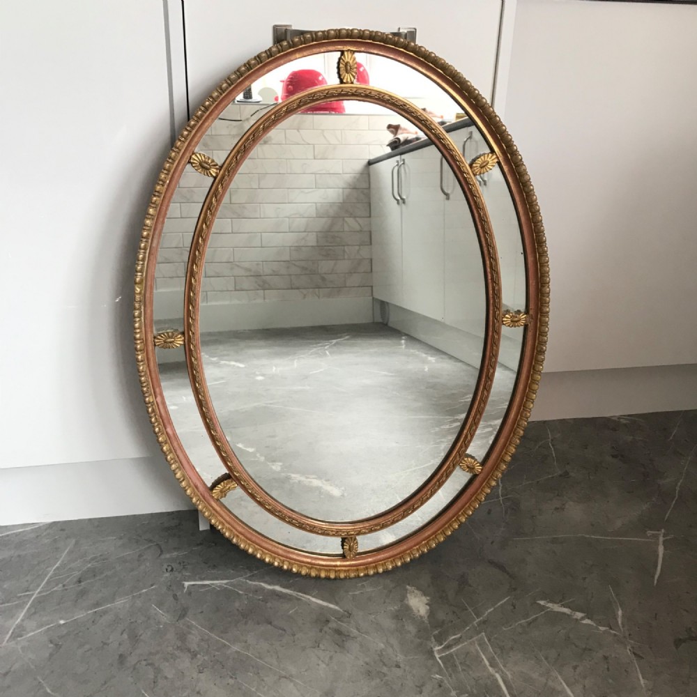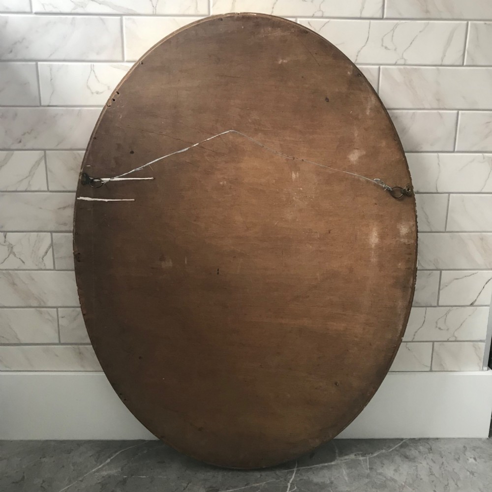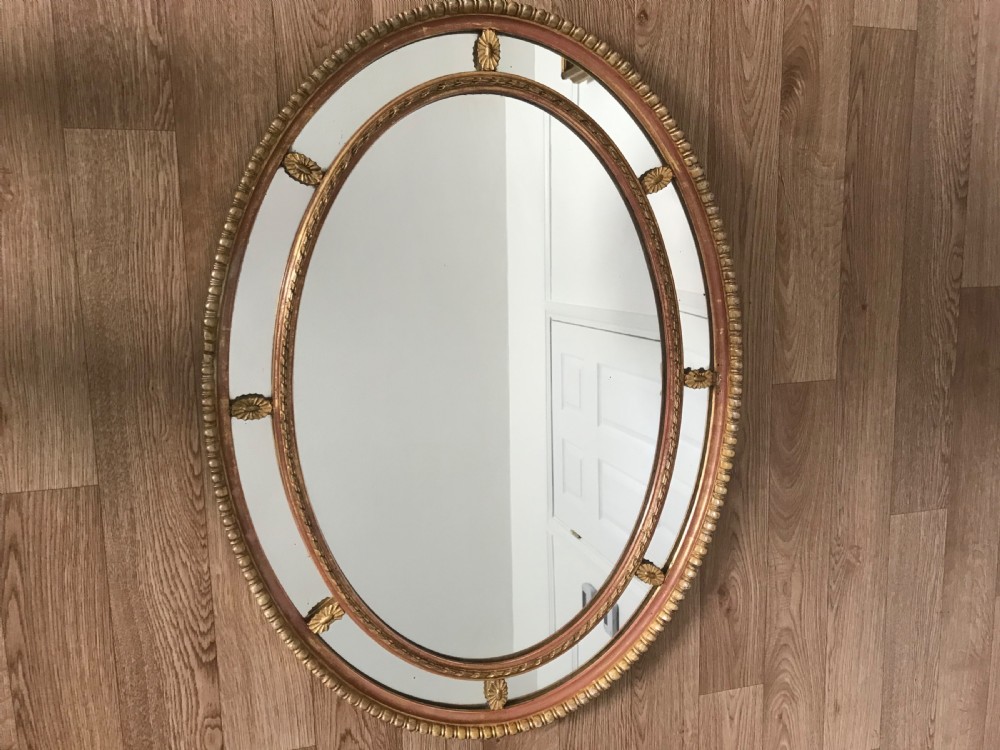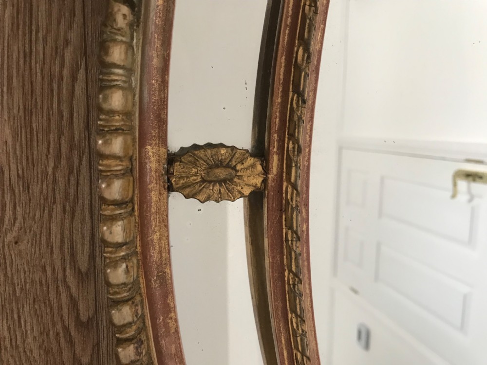 A lovely as found Oval Mirror having sectional gilt gesso frame with oval flower patera rosette decoration with gadrooned edging dating approximately late Victorian period around 1900.