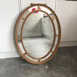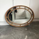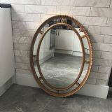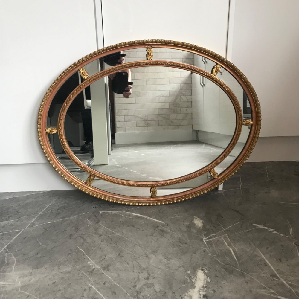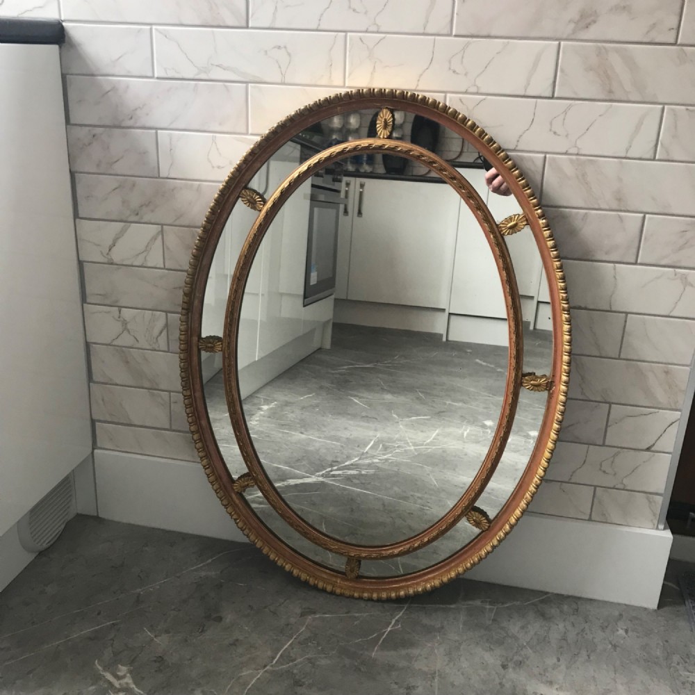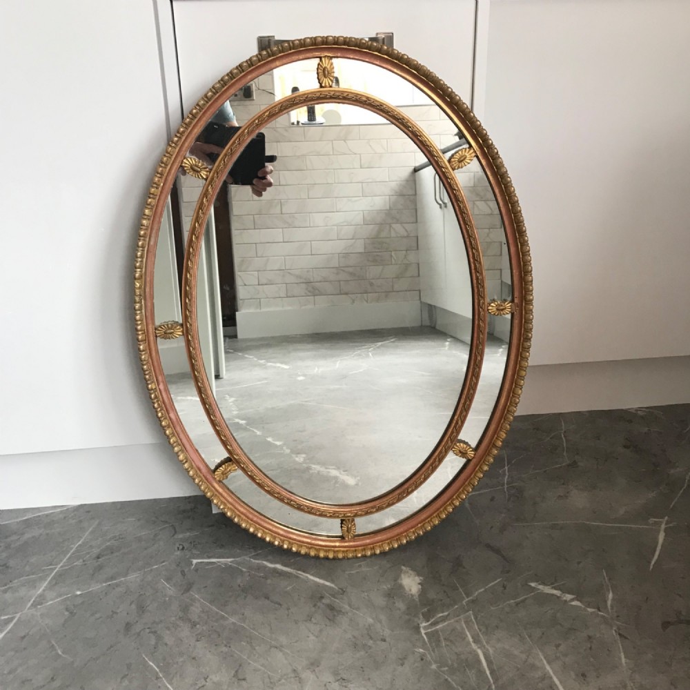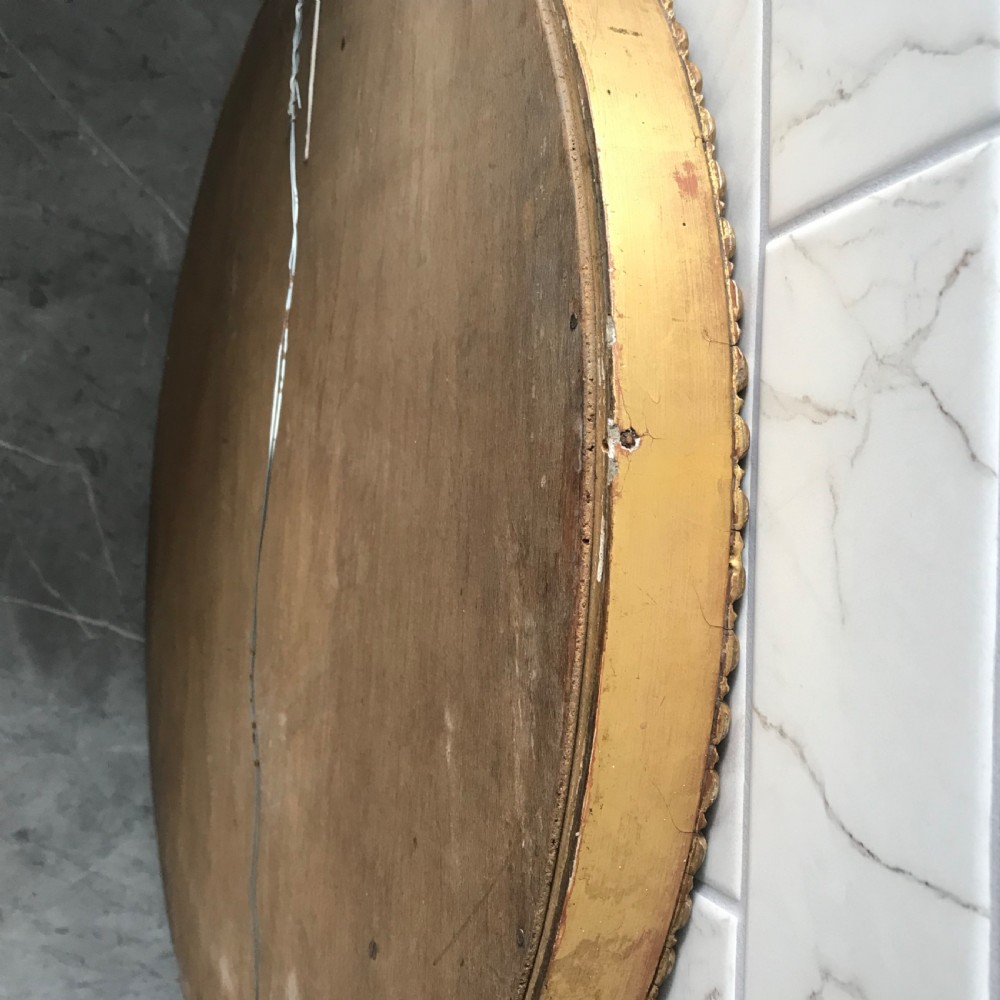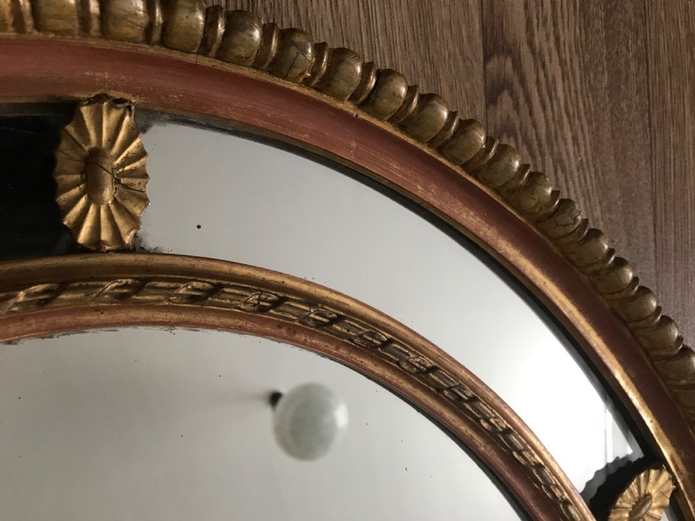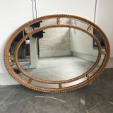 A lovely as found Oval Mirror having sectional gilt gesso frame with oval flower patera rosette decoration with gadrooned edging dating approximately late Victorian period around 1900.