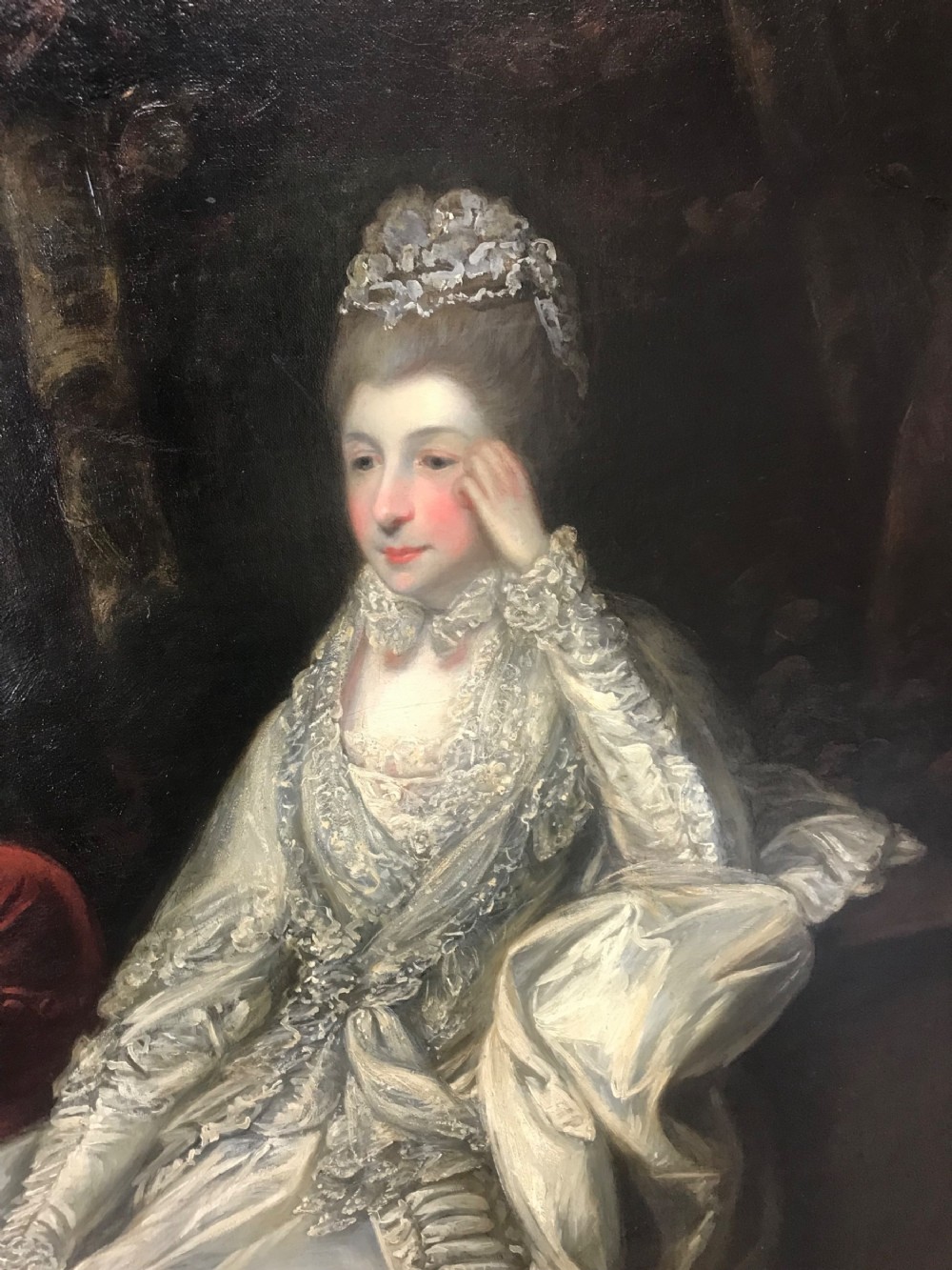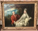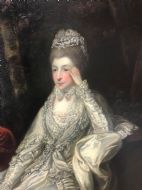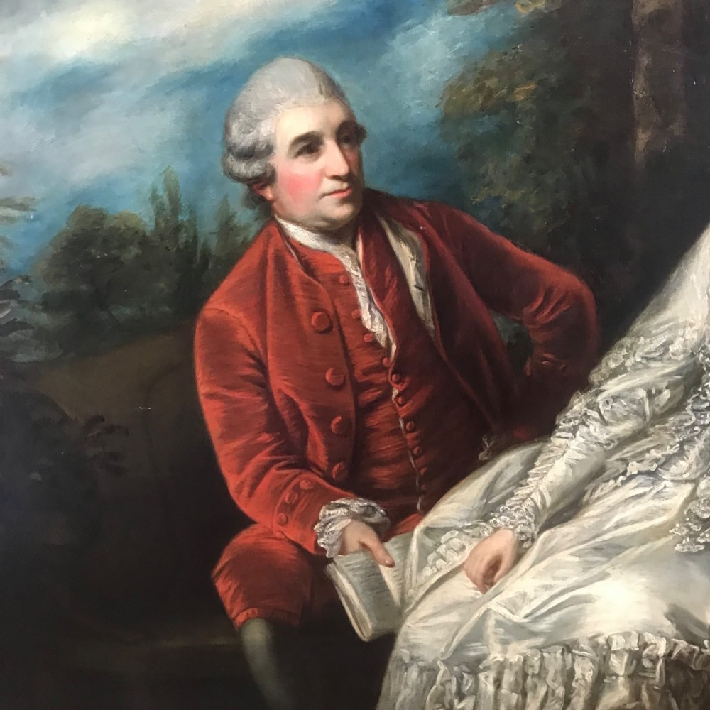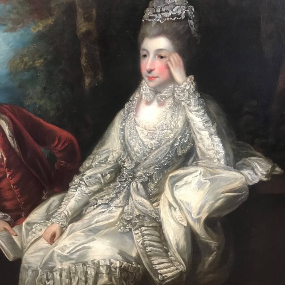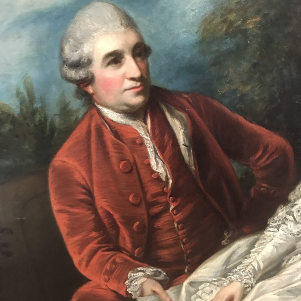 We must say that in our opinion this acquired version could possibly be another work from Reynolds studio and possibly an earlier reduced sample to his larger painting of Garrick and Eva. One could also say that this portrait we offer is technically not strictly a copy as the artist has painted Garrick’s Coat with just four large upholstered buttons down the right side of his jacket , where as the larger version in the National Gallery depicts Garrick with five buttons.