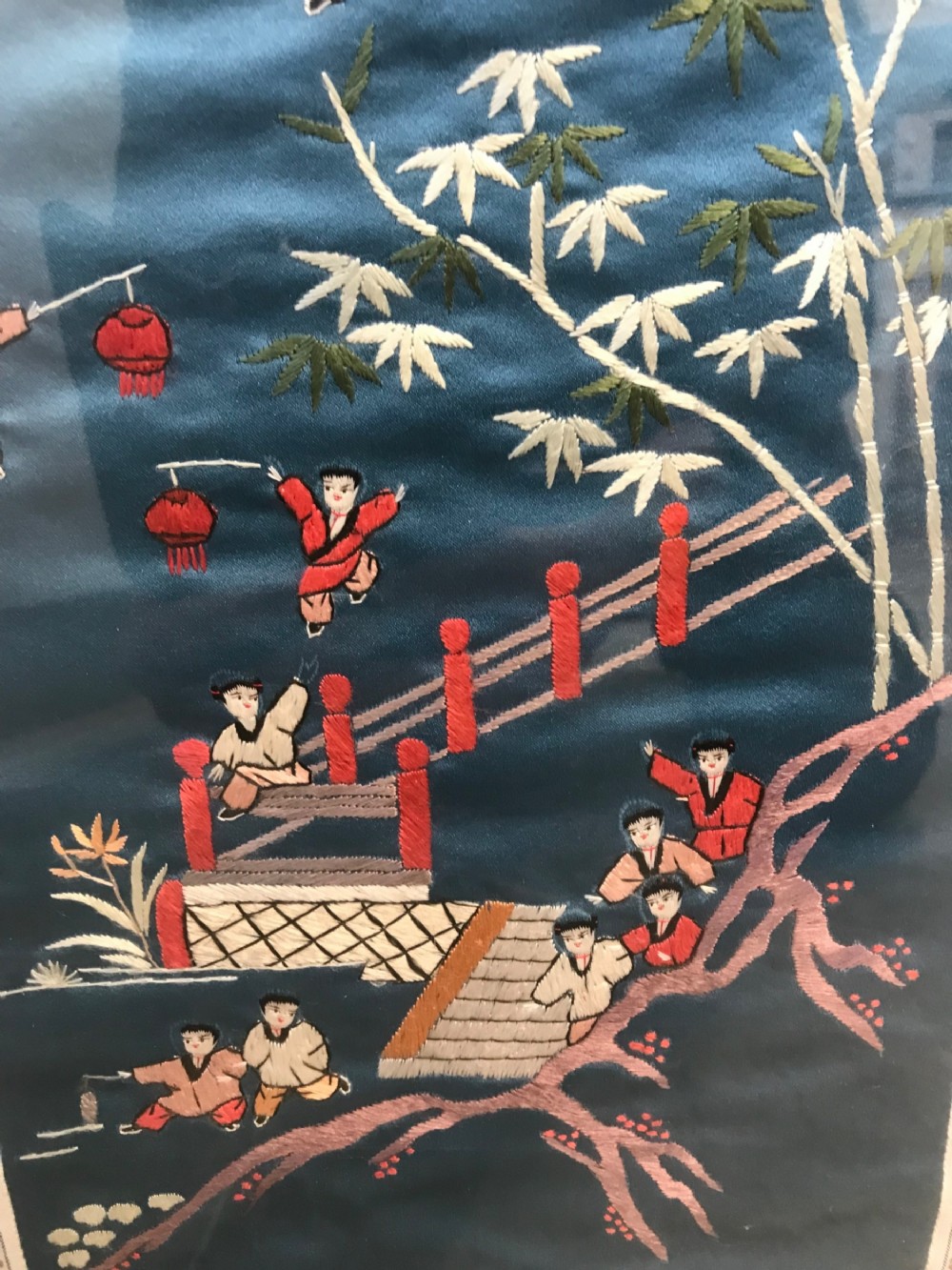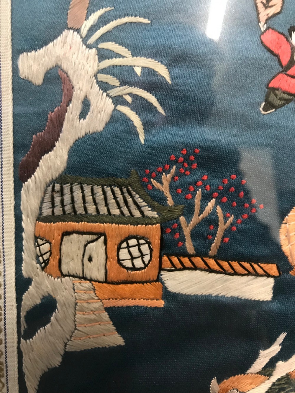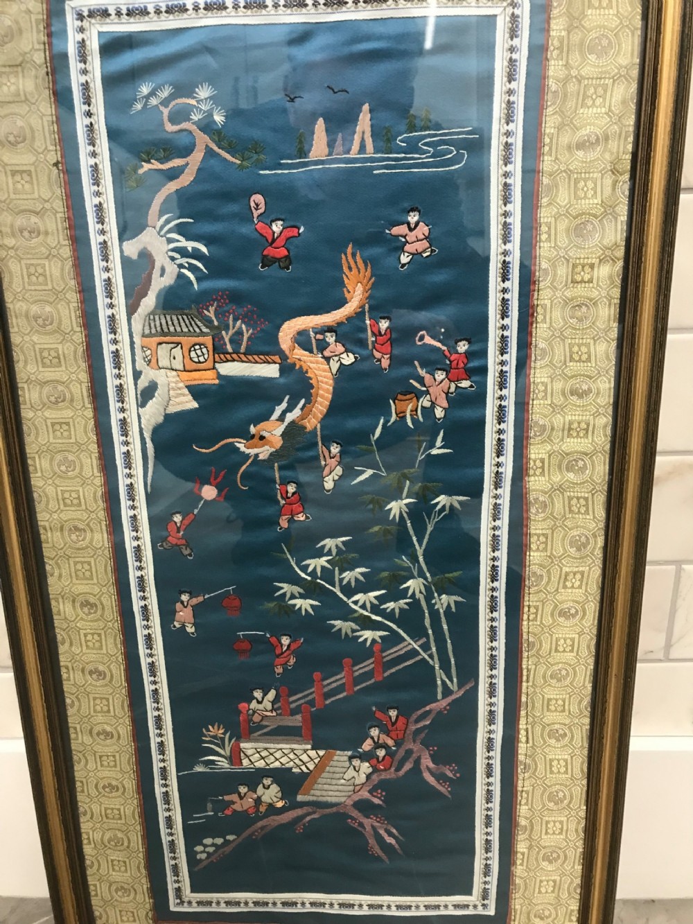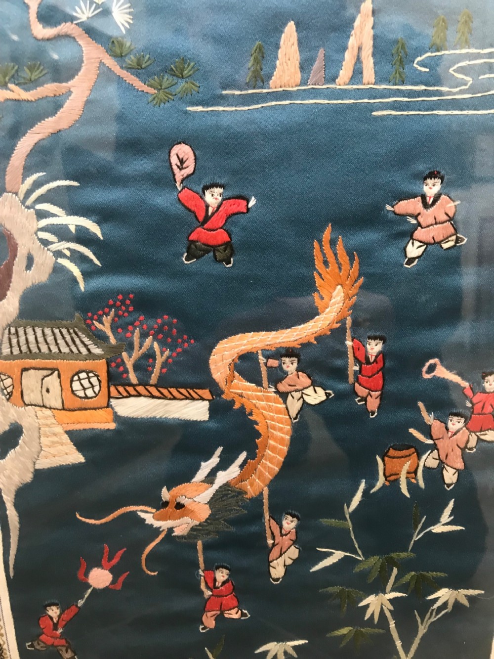 chinese silk embroidery hand sewn panels under glass silk sewn figures dragons trees flowers
