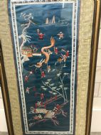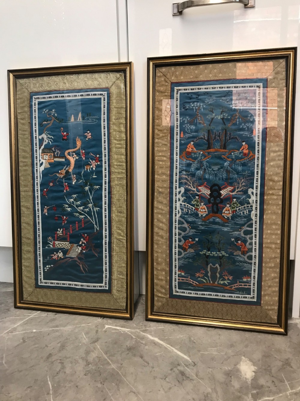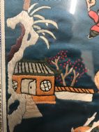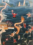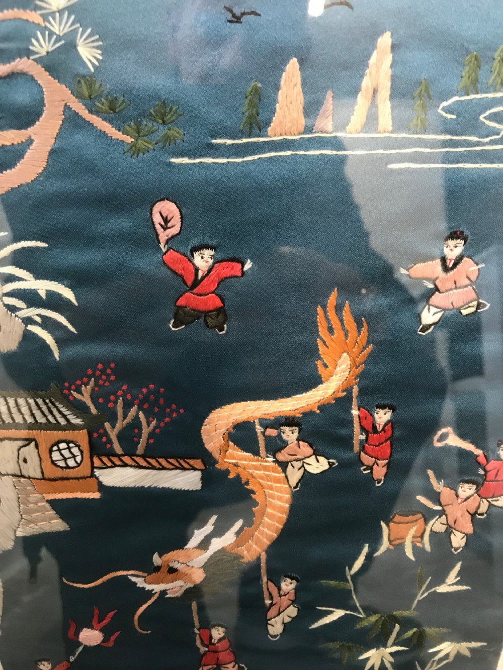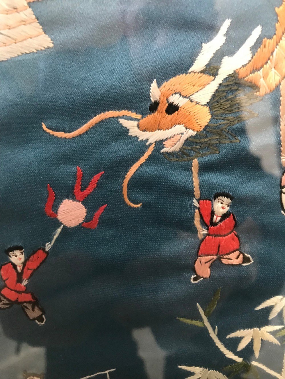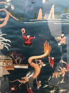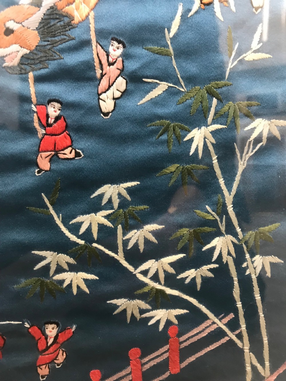 chinese silk embroidery hand sewn panels under glass silk sewn figures dragons trees flowers