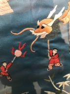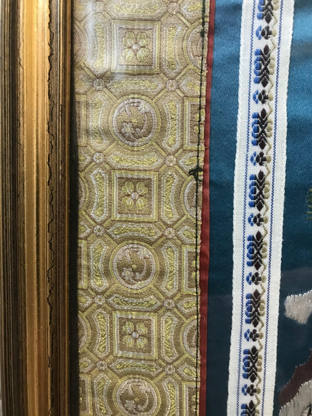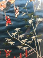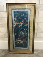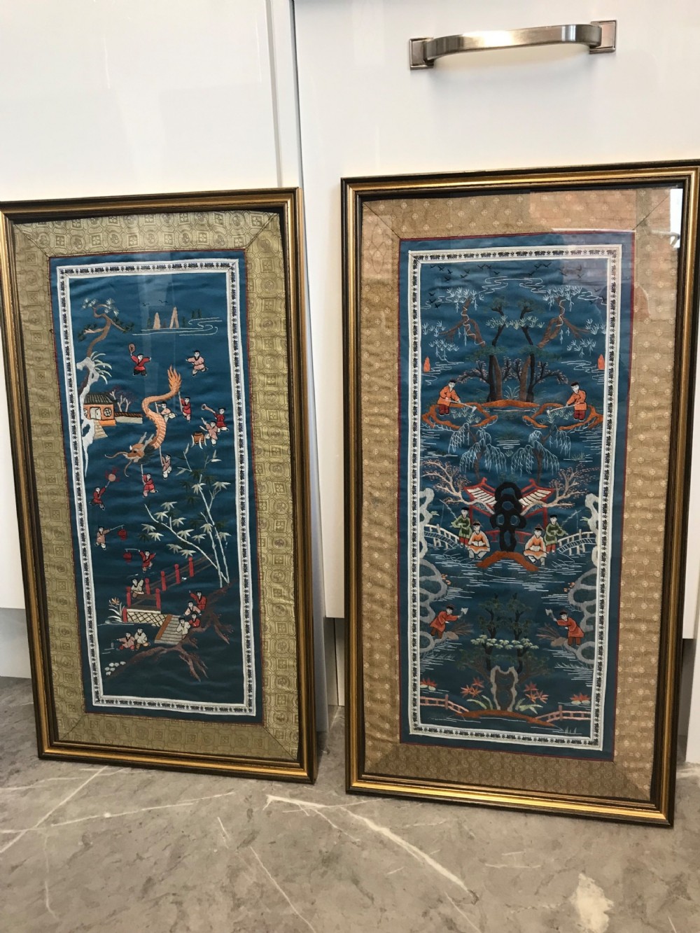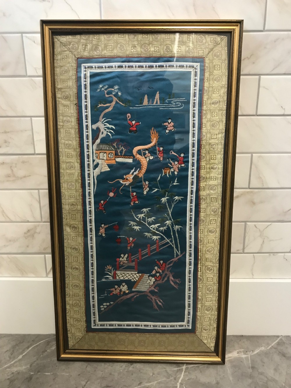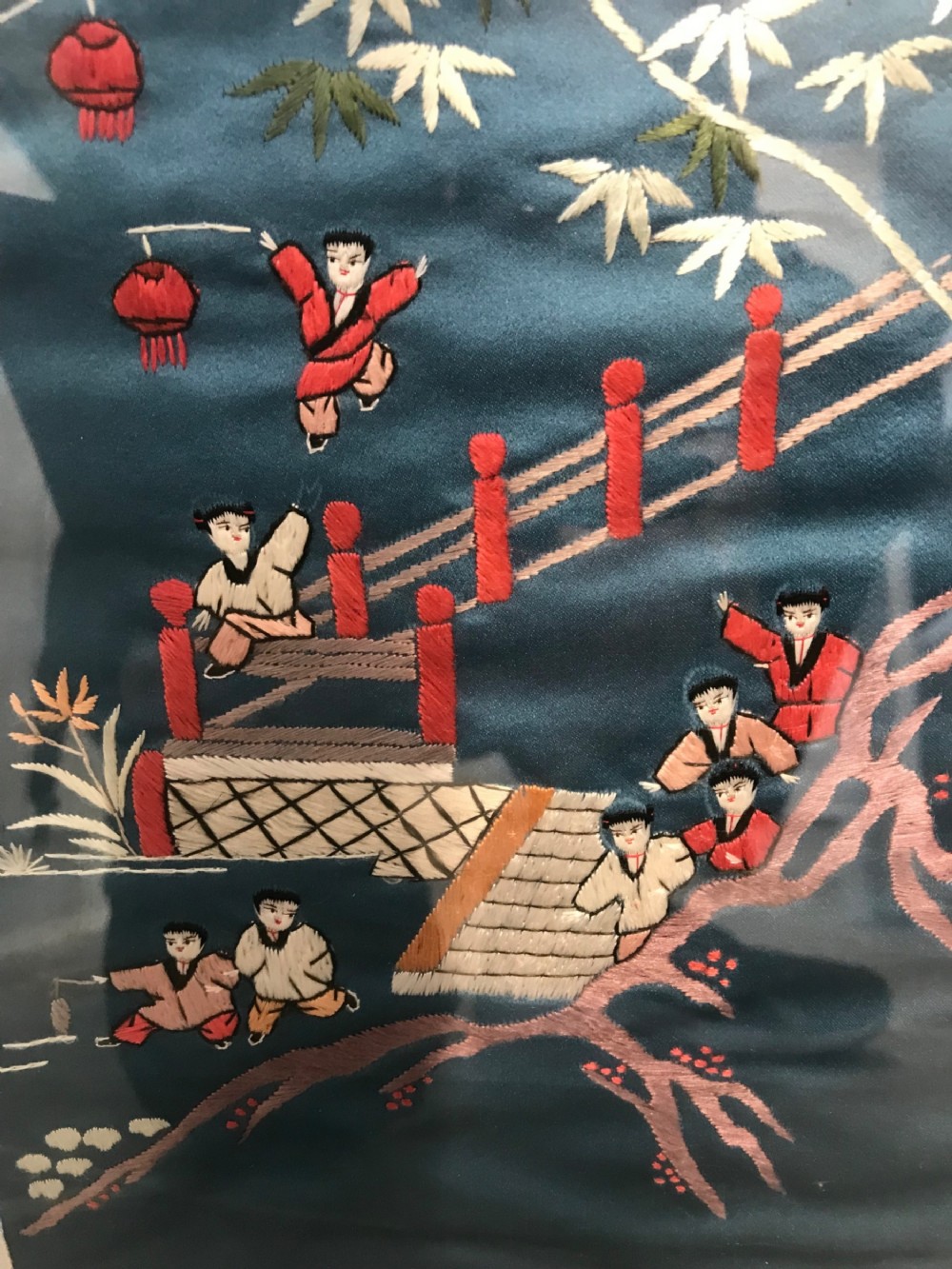 chinese silk embroidery hand sewn panels under glass silk sewn figures dragons trees flowers
