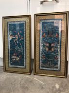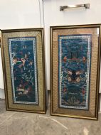Pair of Large Chineses Silk Hand Embroidered Panels Under Glass With Decorative Bordering.