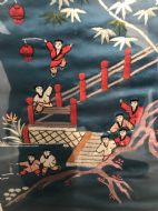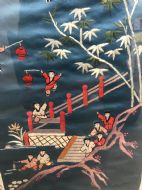 Finished in a rich electric blue base panel and sewn with figures and flowers amongst trees and bridges.