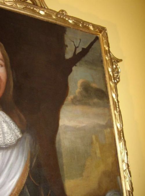 A fine large scale three quarter length late 17th century oil portrait on canvas presented in a period carved wooden gilded frame.