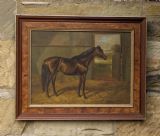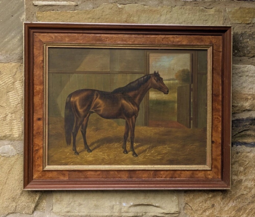 Delightful 19th Century Oil Painting On Oak Panel depicting a Chestnut Bay Hunter Horse in a Stable interior.