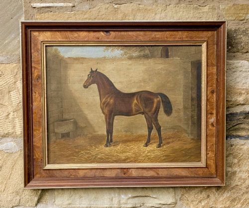 Delightful 19th Century Oil Painting On Oak Panel depicting a Chestnut Bay Hunter Horse in a Stable interior.