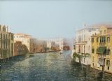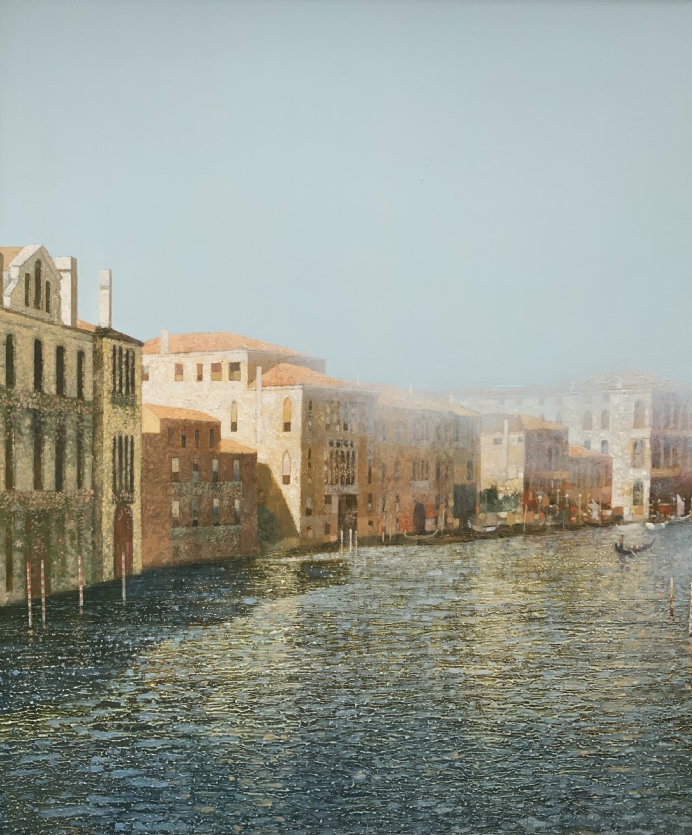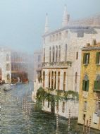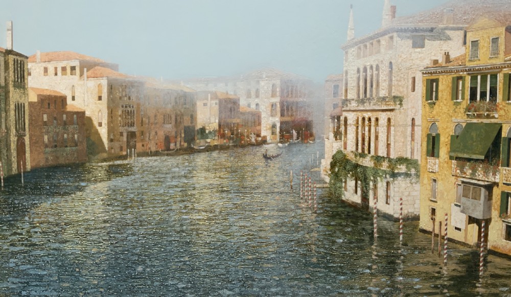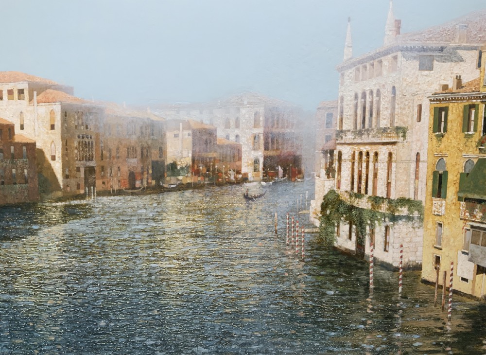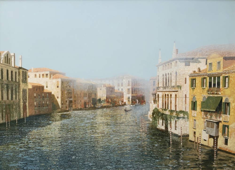 This immaculately presented work portrays a foggy morning with distant views along the tranquil Grand Canal in Venice.