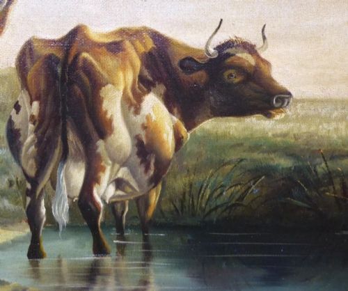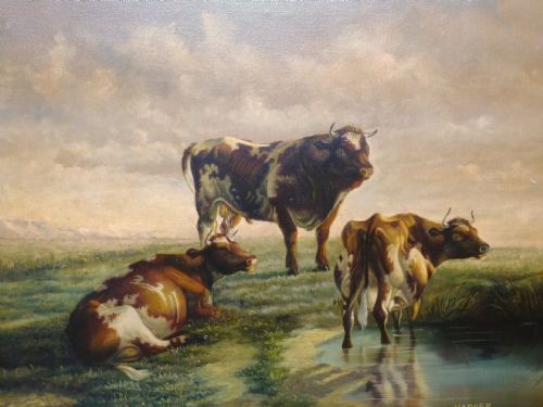 A stunning quality large landscape oil paintings on canvas of Cattle Resting by shallow waters.