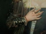 Richly dressed in jewels, rings adorn her finely painted fingers and a bracelet of cornelian beads around her wrist.There is a beautiful string of pearls around her elegant neck and a gold pendant tie adores her dress and lower skirt.The dress has woven gold thread escalope shoulder mounts.