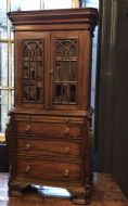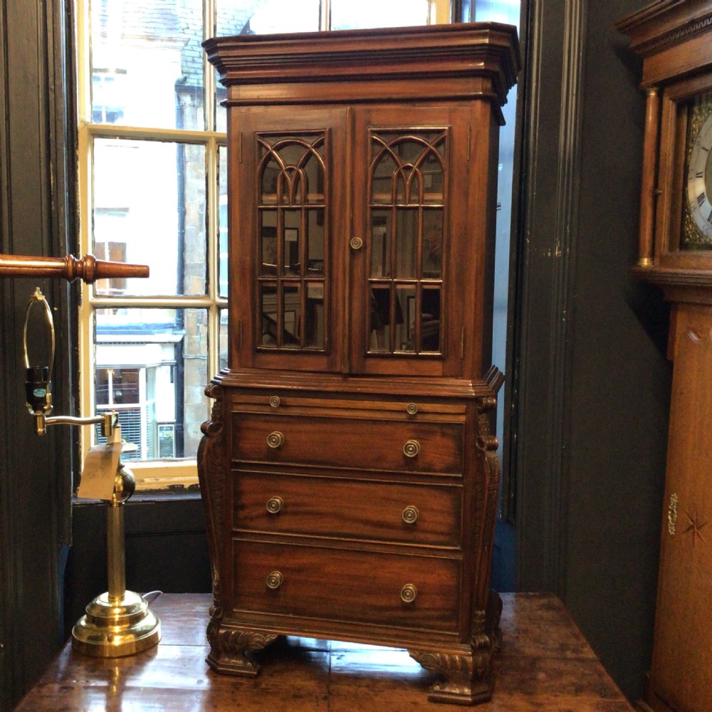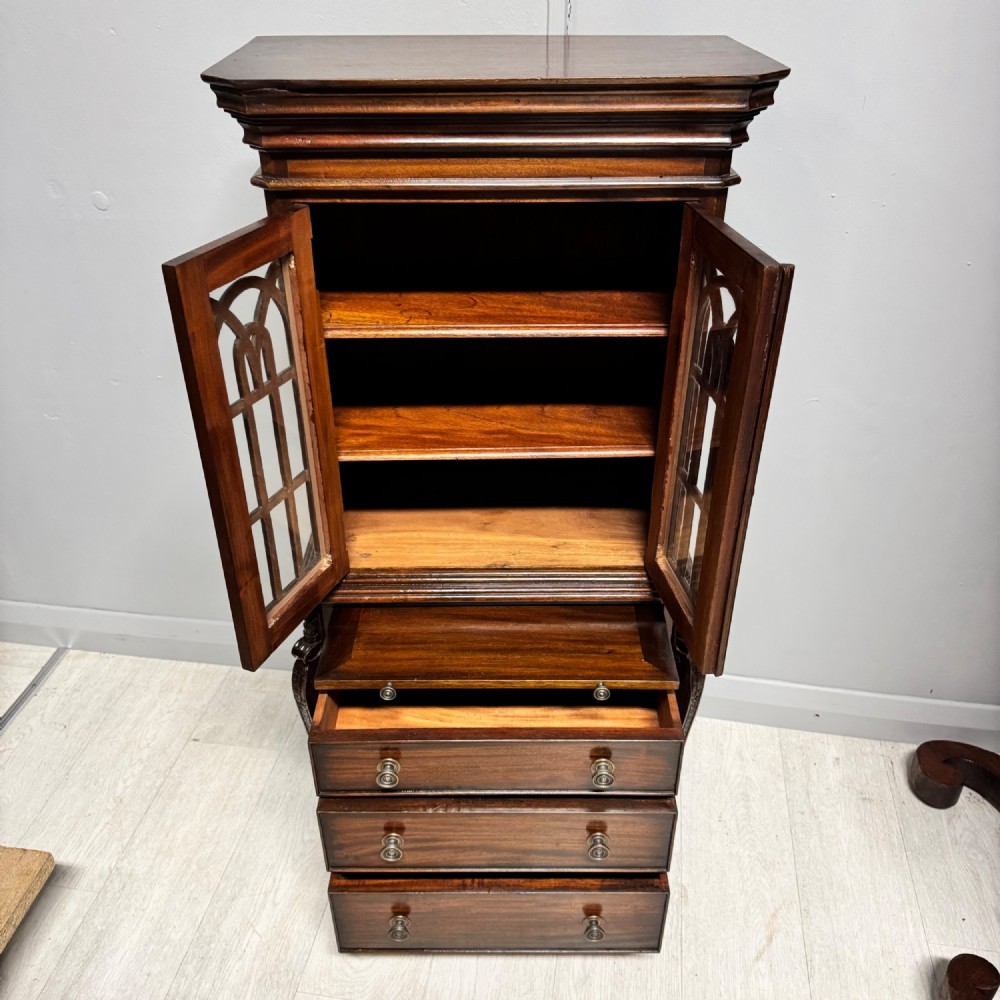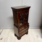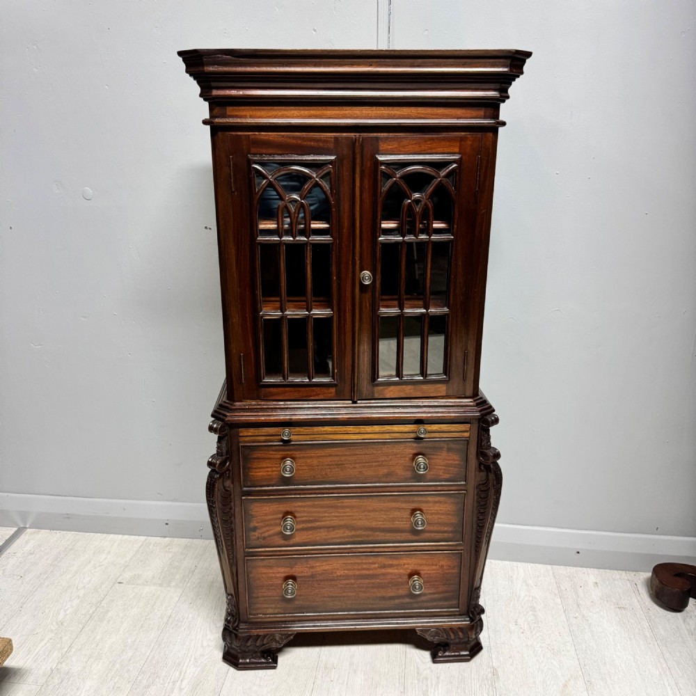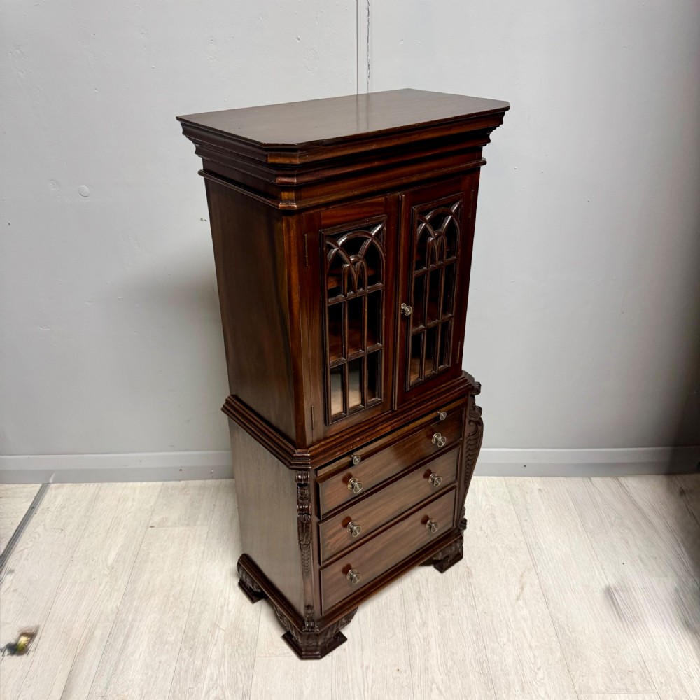 Small Reduced to 1/4 size Miniature Bureau Bookcase cabinet with a 3 drawer base and pull out writing slope below the glazed cabinet with fixed shelves and the top surface ideal for display items such as clocks and ornaments. Unusual item at these dimensions! Does split into two sections, lifts apart, no screws. MEASUREMENTS Height : 42 3/4 inches (109cm) Width : 21 1/2 inches (52cm) Depth : 12 inches (31cm) Dateline of this antique is Edwardian 1/4 quarter size apprentice piece with lovely detail and all dove-tailed joinery drawers. French polished finish with glazed cabinet doors. CONDITION Very good order for age with slight splinter of wood absent from along top left corner, hardly noticeable.See last image. DELIVERY : UK Only £60 / No International Supply TELEPHONE : 07765 856171 Quote Ref 0944 Payments are accepted by Bank Transfer & by Debit / Credit Cards Via the BUY NOW Payment Link Tab shown below each items description. PAY-PAL Account Holders are welcome. CHEQUES Drawn from UK banks. Internal Ref: 0944