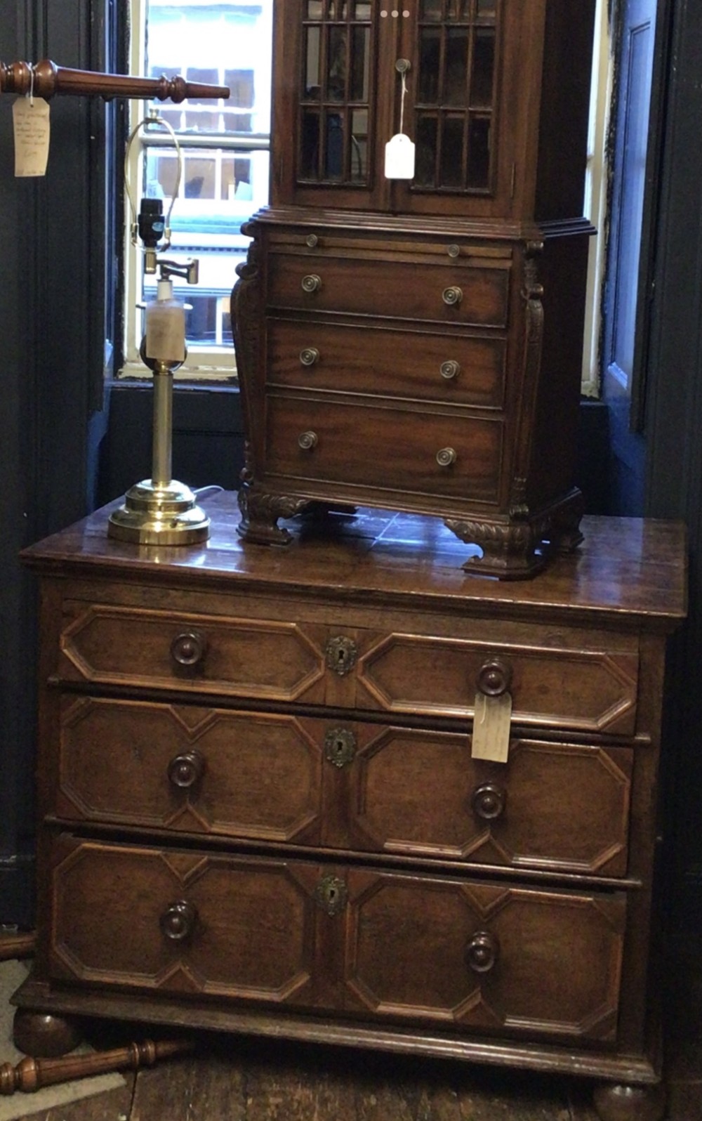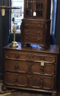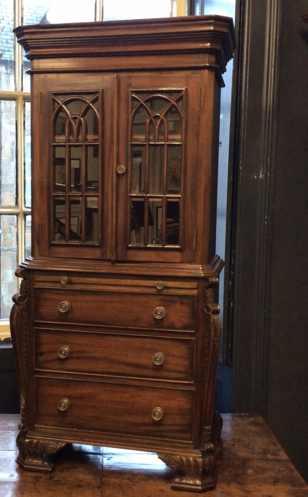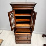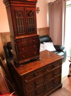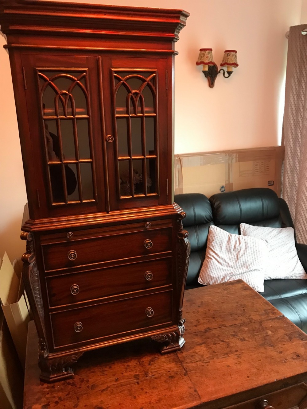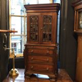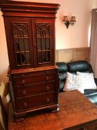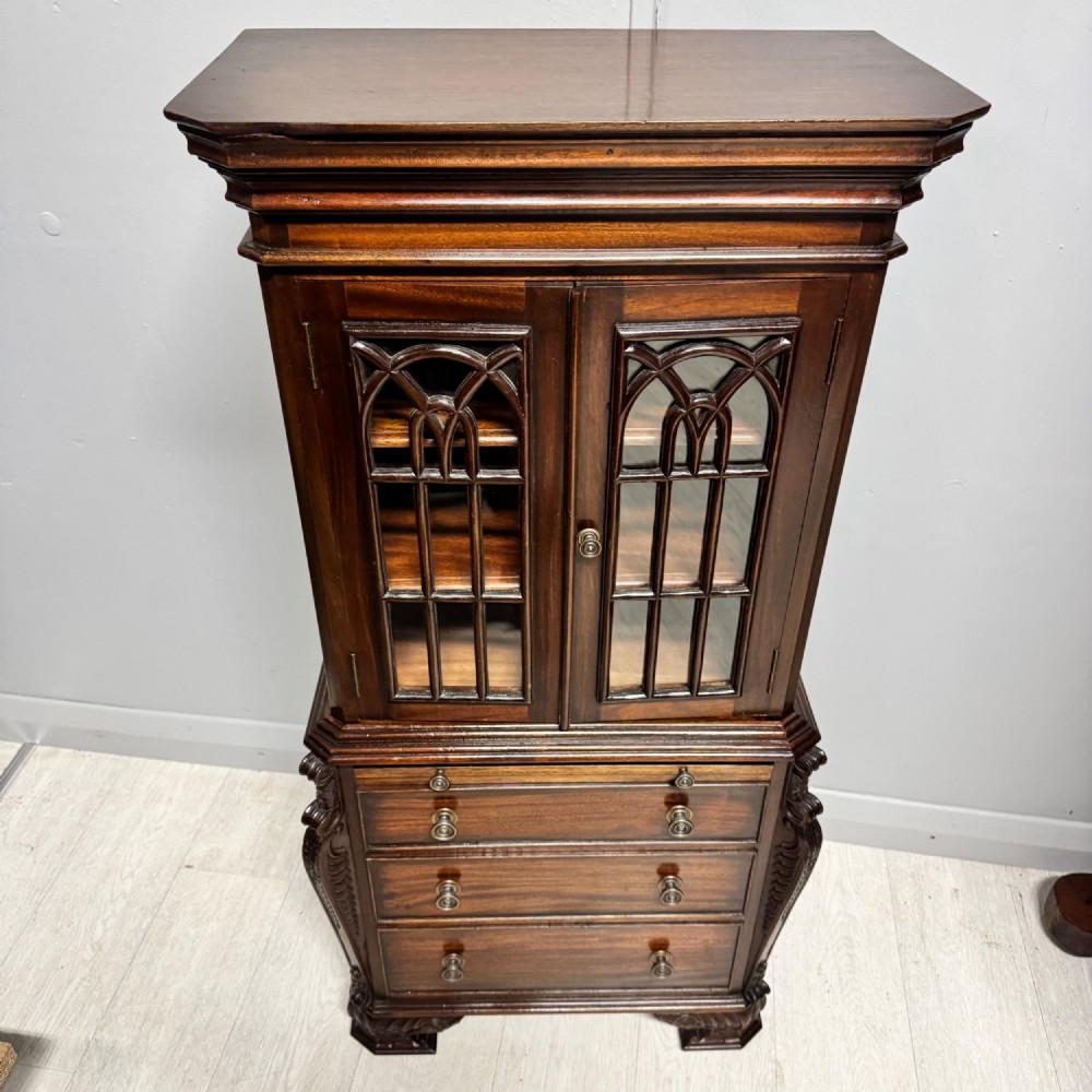Small Reduced to 1/4 size Miniature Bureau Bookcase cabinet with a 3 drawer base and pull out writing slope below the glazed cabinet with fixed shelves and the top surface ideal for display items such as clocks and ornaments. Unusual item at these dimensions! Does split into two sections, lifts apart, no screws. MEASUREMENTS Height : 42 3/4 inches (109cm) Width : 21 1/2 inches (52cm) Depth : 12 inches (31cm) Dateline of this antique is Edwardian 1/4 quarter size apprentice piece with lovely detail and all dove-tailed joinery drawers. French polished finish with glazed cabinet doors. CONDITION Very good order for age with slight splinter of wood absent from along top left corner, hardly noticeable.See last image. DELIVERY : UK Only £60 / No International Supply TELEPHONE : 07765 856171 Quote Ref 0944 Payments are accepted by Bank Transfer & by Debit / Credit Cards Via the BUY NOW Payment Link Tab shown below each items description. PAY-PAL Account Holders are welcome. CHEQUES Drawn from UK banks. Internal Ref: 0944