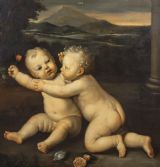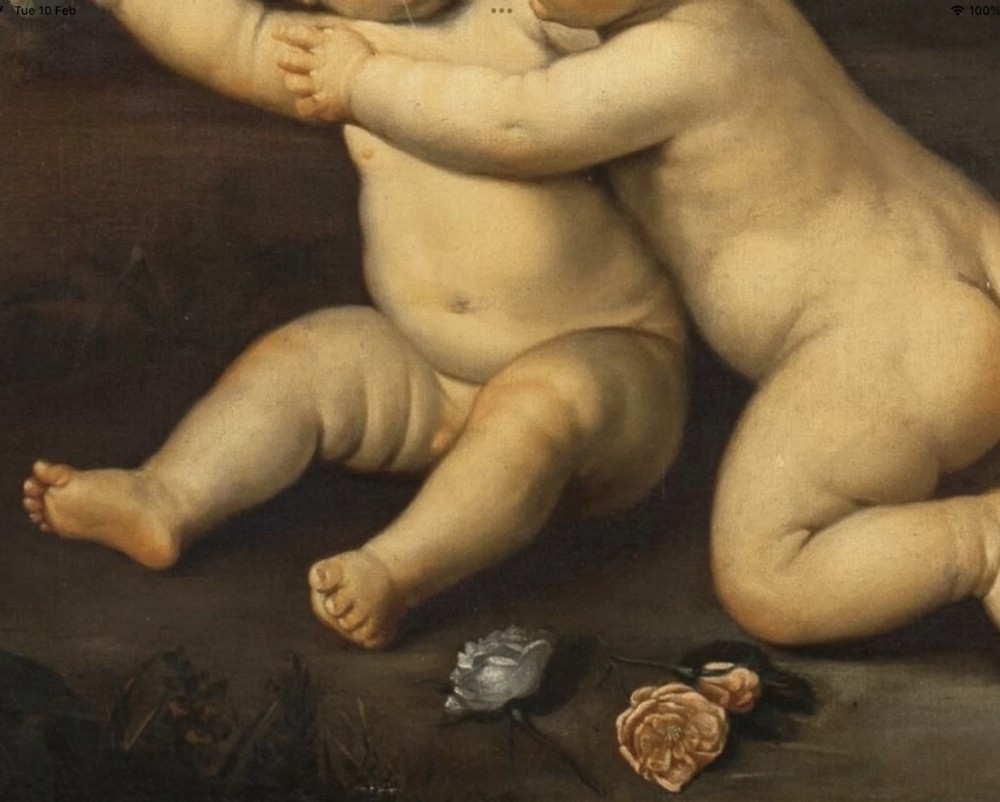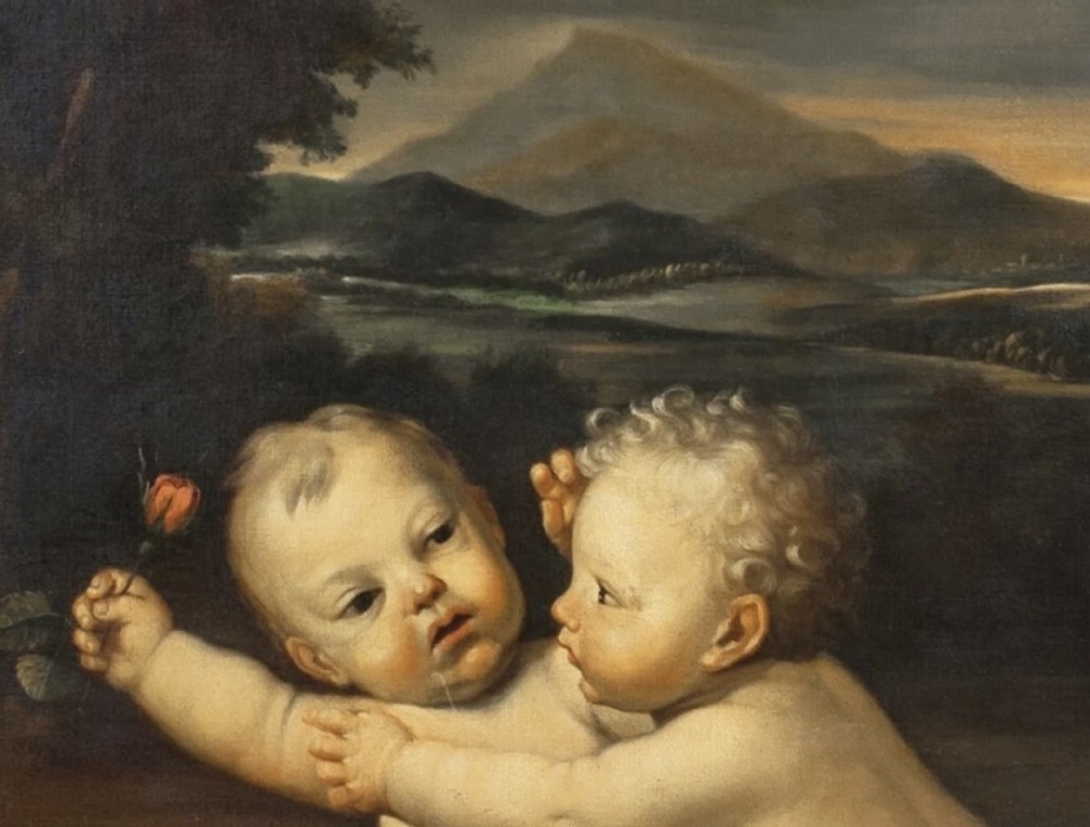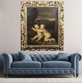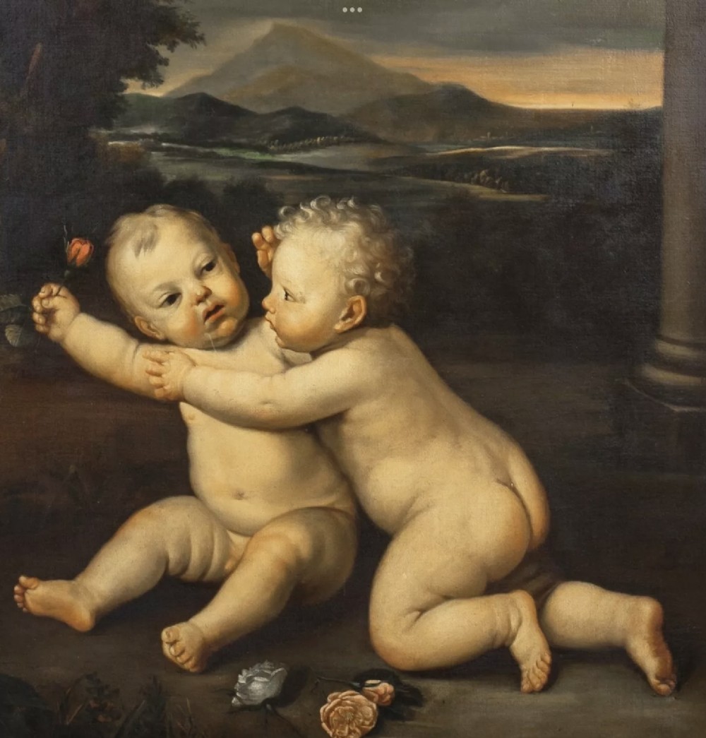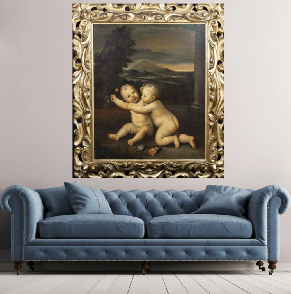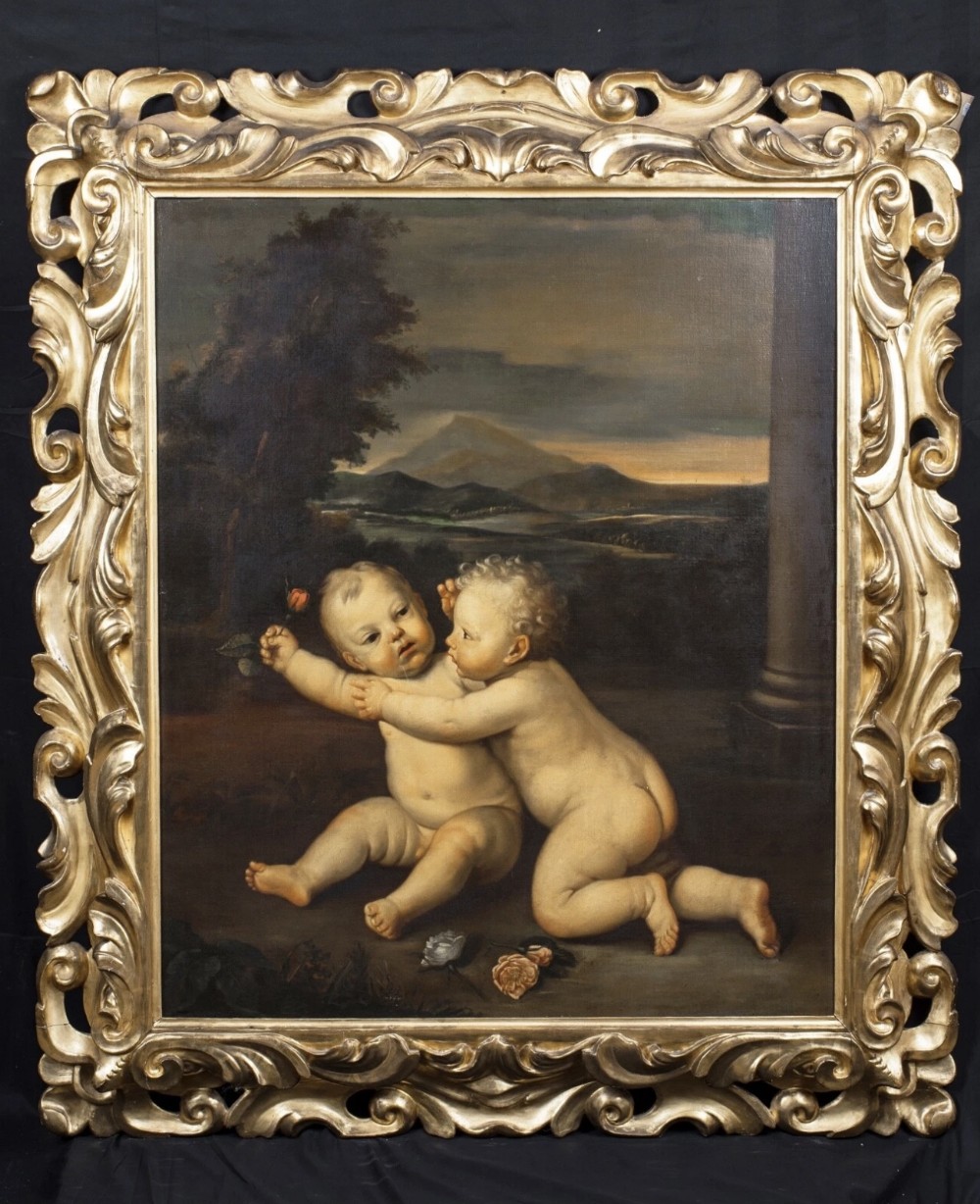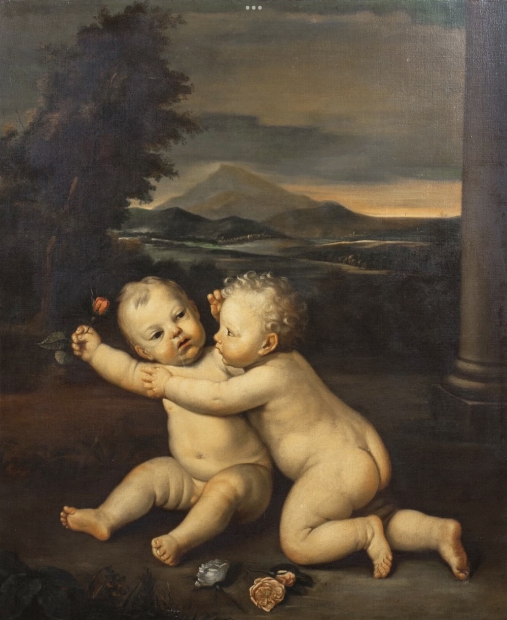 We are pleased to offer for sale a huge Early 19th-century paintings often highlighted by auction houses as "Rudolphine school" refer to artworks inspired by the 17th-century Prague court of Rudolf II, frequently featuring detailed allegories, mythological scenes, or still life's with rich, dramatic chiaroscuro. - These works, often mistaken for later, are characterised by intense, detailed, and often dark, Mannerist-influenced compositions. - Key elements of these paintings from this period include: - Style: Influenced by the 16th/17th-century Northern Mannerism (Prague School), featuring high-contrast light and shadow (chiaroscuro). - Subject Matter: Mythological figures, allegories, and often elaborate, detailed still lifes, sometimes with animals or cherubs. - Context: While the true Rudolphine school existed under Holy Roman Emperor Rudolf II (late 16th/early 17th century), the term is sometimes used to describe 19th-century works that replicate this dark, allegorical style or to mislabeled 17th-century works. - Based on 17th-century art, a painting of a putto sitting and holding a rose typically represents an allegory of love, fleeting beauty, or innocence, often associated with the goddess Venus or, in religious contexts, the Virgin Mary - Several examples from this period show these cherubic figures in such poses. - 17th Century Putti with Rose Paintings - Examples: 17th Century, Emilian School, Putto With Rose: Often specifically oil on canvas showing sitting putto squeezing a flower (rose or peony) while looking at the viewer. Often featuring a soft, light-filled style typical of the Emilian school. - 17th-century, Italian School, Still Life with Putti: A Roman 17th-century oil painting, sometimes found in pairs or sets, depicts putti alongside flowers and fruit. - Carlo Innocenzo Carloni, Putti Holding Flowers: While some of his work extends into the 18th century, Carloni’s style of putti, often sitting or reclining among roses and flowers, reflects the late Baroque/early Rococo transition. - Workshop of Rubens, Putti with Flowers: Rubens frequently used putti in his commissions, often as part of larger, triumphant allegories. - Symbolism and Style: The Rose: Symbolises the fleeting nature of love and the joy it brings, or in Christian art, the "Rosa senza spine" (rose without thorns) representing the Virgin. - Putti Characteristics: In this period, putti are often depicted with soft, chubby, amber-skinned bodies, frequently set against a soft or dark, atmospheric background. - Allegory of Summer: In some, particularly northern European, examples, putti holding flowers or sitting among foliage are used to represent the season of summer or spring. - These types of paintings were popular for private collections or as, for example, "over door" decorations. - INSCRIPTION A penned inscription says “ after “ artist Domenico Zampieri 1849. - SAMPLE IMAGE / FROM AUCTION LISTING Small 17th Example of the same Cherubs attributed to Domenico Zampieri, stating a pre cartoon of a work or cut down piece from a much larger scale work , perhaps no longer in existence. - Our example is finished with rose in hand and has flowers painted in the foreground placed within a full landscape with stone pillar to the right margin providing scale, having a sunset and mountainous terrain beyond with sky. - FRAME Presented in an early 19th century Venetian Gilt Carved Wooden Frame of Italian origin. - RESTORATION This huge Oil Portrait on canvas is currently away under going a light clean and further refurbishment to museum standard. - DELIVERY UK By Specialist Art Courier £150 Worldwide : EU £1000 / USA £1200 - TELEPHONE Enquiries : 07765 856171 - Quote Ref : 0952 - Payments are accepted by Bank Transfer & by Debit / Credit Cards Via the BUY NOW Payment Link Tab shown below each items description. PAY-PAL Account Holders are welcome. CHEQUES Drawn from UK banks. Internal Ref: 0952