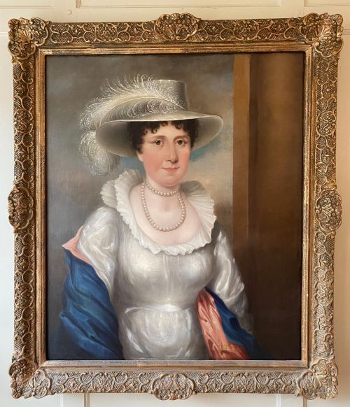Fine Oil Portrait Of Elegant Young Lady Wearing Silk Dress & Pearls 19th Paintings