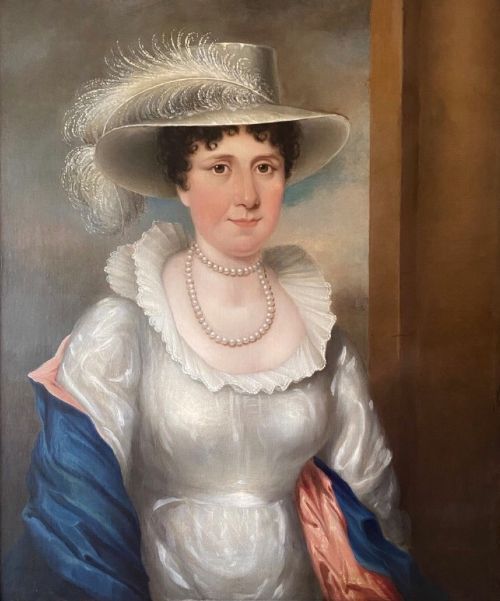 A high society lady dressed impeccably to impress and painted looking directly at the viewer to attract their attention.