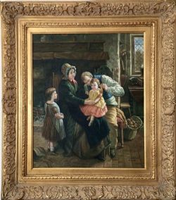 We are pleased to offer for sale this lovely three quarter length portrait of an elegant Lady, standing with her chow chow dog beside her, by the Scottish artist John Horsburgh 1835-1924, who has signed the painting Horsburgh Edin' and indistinctly dated it, possibly 1901, in the lower right hand corner. The lady is wearing a large cream coloured hat decorated with ostrich feathers on her upswept auburn hair. She is wearing a cream, high necked tea gown, decorated with cream lace on the bodice, down the skirt, around the upper sleeves and on the wrist, and has a gold coloured wrap edged with cream feathers draped over her wrist. The lace neckline of the dress is backed by turquoise material, which matches the turquoise jewellery that she is wearing, including a heart shaped pendant, a long gold necklace with turquoise beads, and two diamond and turquoise rings, as well as a diamond bangle on each wrist and a diamond ring on her right hand. - We thought it might be interesting to discover the history of the chow chow dog in Scotland and found that a lady by the name of Lady Dunbar of Mochrum wrote a book about chows in 1914, which had two more editions published until 1924 and is still well regarded today. We saw a photograph of this lady with two of her blue chows and it is therefore a strong possibility that this is her, but details about her are limited, other than that we think she was the wife of the 9th Baronet of Mochrum. - John Horsburgh, 1835-1924 was born on 6th February 1835 in Eddleston, Peeblesshire, the son of a shoemaker. He was apprenticed to a silk mercer in Edinburgh in his youth, but his interest soon turned to photography, and by 1863, he had set up his studio in Edinburgh in South Bridge, which moved briefly to 17 Princes Street and finally to 131 Princes Street by 1868. By the 1871 Census, he was living at 13 Abbortsford Park Edinburgh and he was employing 3 photographers and 3 artists, presumably to colour in the photograhs, which was often done in those times. In the 1881 Census he was a man of 46, listed as an Artist and Photographer and living at 10 Strathearn Road. - Between 1889 and 1898, his business changed to John Horsburgh & Son (This son being John Alfred Horsburgh, born 1862, who also painted). In 1891 he was living at 'Albania', 48 St. Albans Edinburgh where he was working from home as an Art Consultant and Painter. After 1898, when John Senior retired from the photography business, the business became John A. Horsburgh until 1915 at 4 West Maitland Street. By the 1901 Census, he was listed as a Retired Artist and Portraitist at Aberdour House, Aberdour, Fife. (This house was used by Admiral Beatty of Jutland fame during WWI) However, he was still offering his services as a portraitist in the 1920s, according to his letter head, where he offered portraitute without tedious life sittings at The Langham Hotel in London, in private residences, chambers and clubs, and in Corstorphine in Edinburgh. Possibly he based his portraits on photographs to avoid the sittings). At some stage, he was apparently elected a Fellow of the Royal Scottish Society of Arts, as some of his paintings show FRSSA after the signature. - John Horsburgh died at the end of September 1924, as his obituary appeared in The Scotsman on 1st October 1924. Anyone wishing to see more examples of his work, details of his family life (he had 10 children by his wife Agnes, nee McIntosh, who he married in 1856, 8 of whom survived him). - MEASUREMENTS Image Size: 41 5/8" x 29 1/2" - 105.25cm x 74.9cm Frame size: 53" x 41" - 134.6cm x 104.1cm - CONDITION Very good order for age, with original frame. - DELIVERY : UK BY Man & Van £95 Worldwide : EU £350 / USA £450 - TELEPHONE ENQUIRIES 07765 856171 - OUR Ref 0707 - Payments are accepted by Bank Transfer & by Debit / Credit Cards Via the BUY NOW Payment Link Tab shown below each items description. PAY-PAL Account Holders are welcome. CHEQUES Drawn from UK banks. Internal Ref: 0707