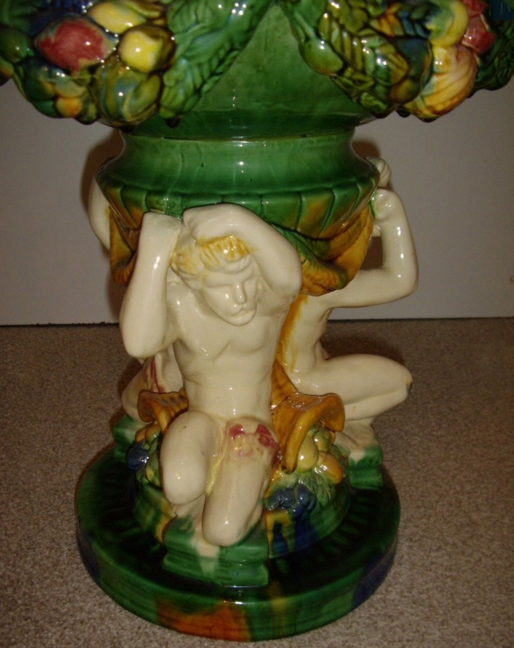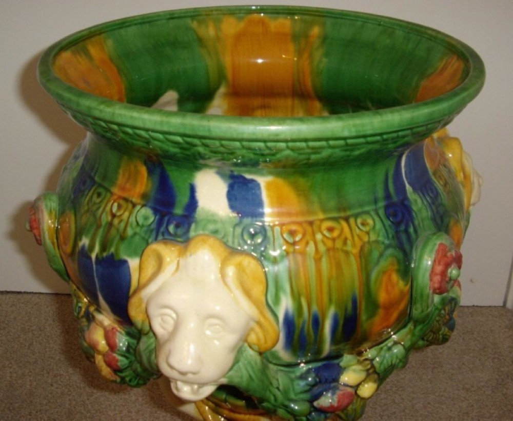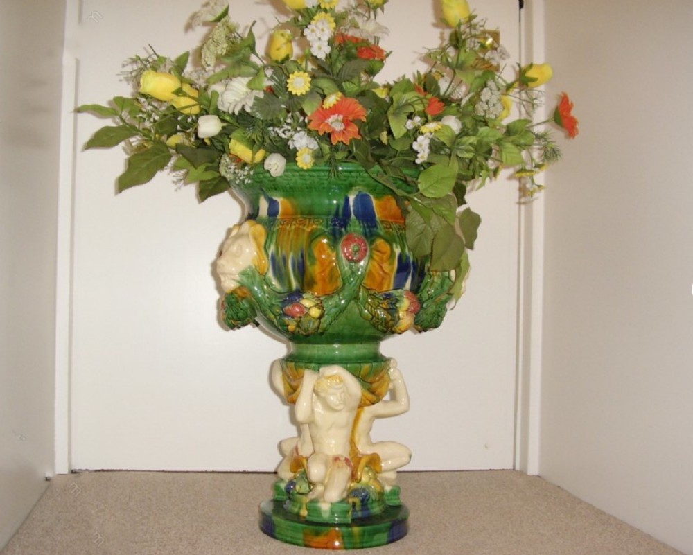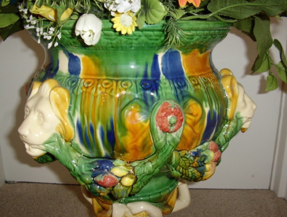 A LARGE MAJOLICA STYLE PLANTER FOR IN DOOR OR OUT DOOR USE. - The planter is hand finished in a mixture of glazed and fired colours with similarities in pattern and design to English majolica.The item has a highly polished finish. - Manufactured to a good standard of finish,has been produced to stand a potted plant inside. This type of pottery is produced in Italy where the well known Capo De Monte originates. - It is recommended to keep all plants inside a sealed plastic vessel to avoid any water ingress into the porcelains surface. - The plinth is all in one and made of three Grecian naked gentlemen bearing supporting the upper bowl,decorated with lion heads. - MEASUREMENTS Total Height to rim 22 Inches ( 56 cm ) Diameter of upper bowl 13 Inches 33 cm ) Diameter of round base piece 9 Inches ( 23 cm ) - CONDITION Excellent throughout, no damage or repairs. - The flowers are optional for an extra £25 at cost - UK Mainland Delivery Including Packaging is £50 - TELEPHONE ENQUIRIES 07765 856171 - OUR REF 0666 Payments are accepted by Bank Transfer & by Debit / Credit Cards Via the BUY NOW Payment Link Tab shown below each items description. PAY-PAL Account Holders are welcome. CHEQUES Drawn from UK banks. Internal Ref: 0666
